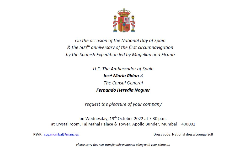 Invitation to ISCC members to join celebration for ‘National Day of Spain & 500th anniversary of first circumnavigation by the Spanish Expedition led by Magellan and Elcano’ hosted by Mr. José María Ridao, H.E. The Ambassador of Spain, and Mr. Fernando Heredia Noguer, Consul General at Taj Mahal Palace, Mumbai