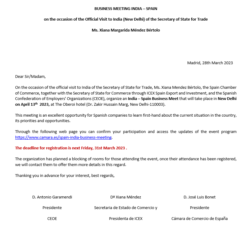The Indo-Spanish Chamber of Commerce in collaboration with the Spain Chamber of Commerce organized the Spain-India Summit including the Spanish Embassy in India, The Confederation of Business Organizations, and the Ministry of Industry, Commerce, and Tourism.