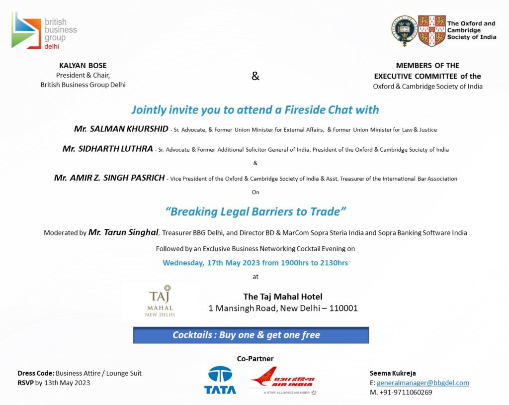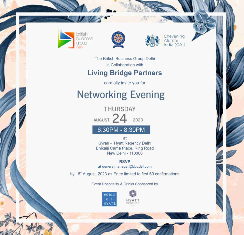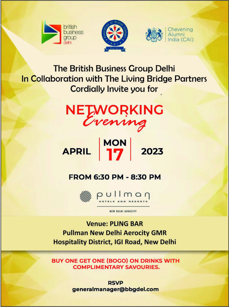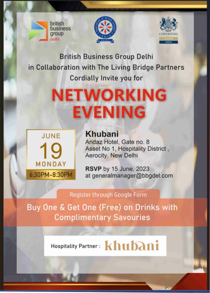 Invitation to ISCC members to networking evening at Pullman, New Delhi, Aerocity on the 17th of April (Monday), 2023 | 6:30 – 8:30 PM organised by The British Business Group Delhi In Collaboration with The Living Bridge Partners. The event was held in partnership with Chevening Alumni India & Association of British Scholars.