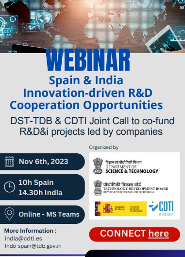 ISCC members were shared an invite for the CDTI (Centre for the Development of Industrial Technology) hosted webinar with the Department of Science and Technology (DST) and the Technology Development Board (TDB) from the Government of India.